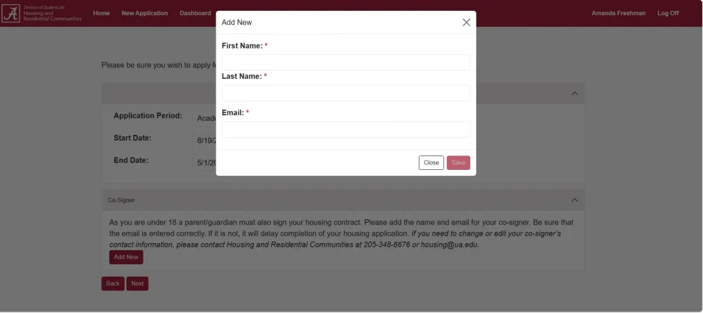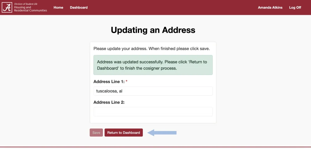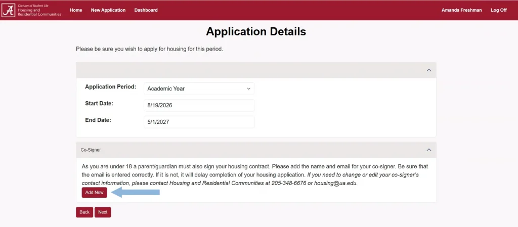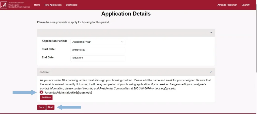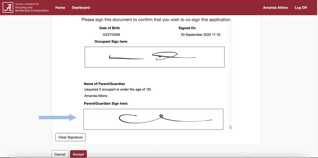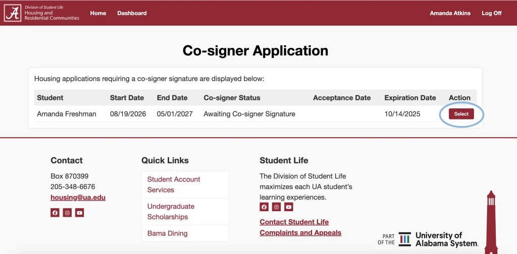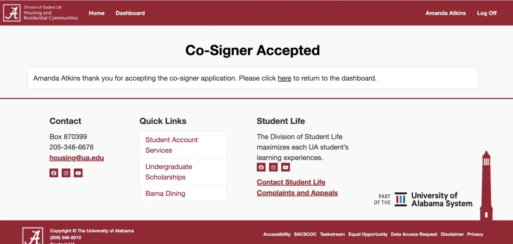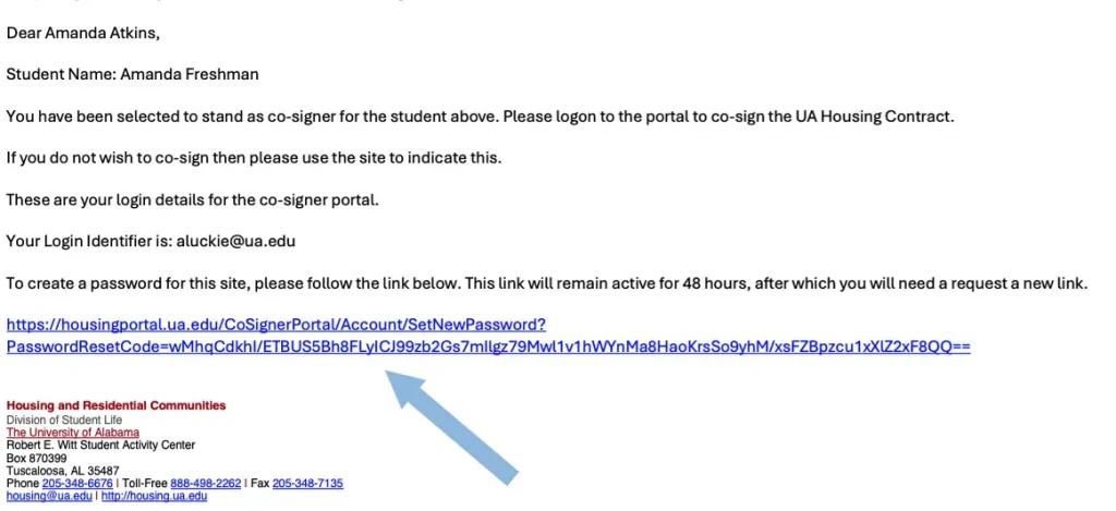 - Your co-signer will receive an email from housing@ua.edu (sent to the email address entered earlier).