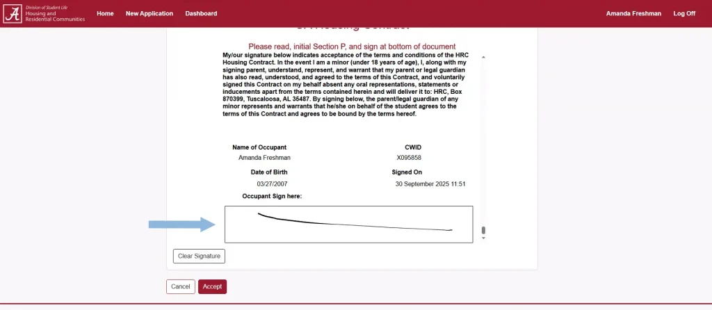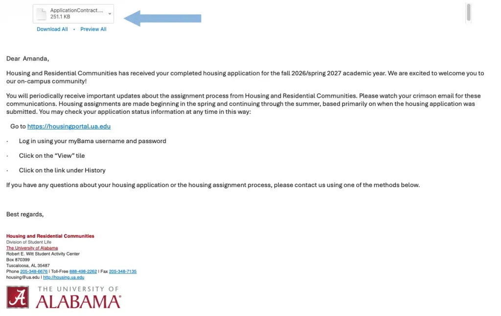 - You will also receive a confirmation email from housing@ua.edu with the contract attached.