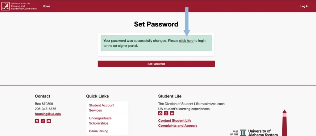 - After setting the password, select “Click here” to log in to the co-signer portal.