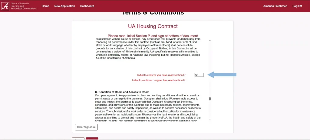 - The co-signer should initial section P, sign at the bottom of the contract, then click “Accept.”